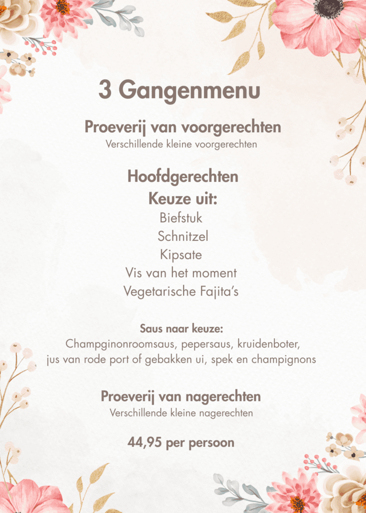 Wil je lekker eten en je laten verrassen? Met ons 3-gangenmenu krijg je een mix van gerechten waarbij je het hoofdgerecht zelf kiest en het voor- en nagerecht een verrassing zijn.